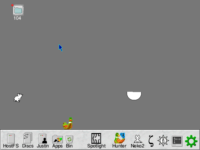 I started with a couple of pretty neat little sillies that I liked, which I rewrote to use the new PinboardServer protocol. !Neko is pretty well known, and had been ported by Michael Bankstahl. I took the sprites and examined the way that !Neko worked to create a new version which worked with the protocol. Because I wasn't as clever as the original author, I couldn't work out how to detect the edges of windows - so !Neko just ran underneath everything, rather then clawing at the sides of windows.
